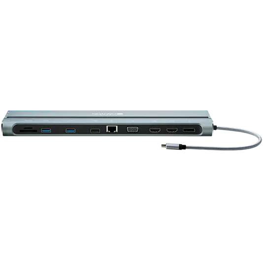 If your laptop is equipped with USB type-C, this universal docking station CNS-HDS90, which is the 3rd generation of the popular model, will improve its connectivity features with 14 built-in ports to the maximum. Using Display Port (4Kx60Hz) and VGA, you can connect your laptop to four monitors simultaneously. The up to 100W USB-C PD charging port allows you to charge your connected device at optimal speed. Also, the USB hub Canyon HDS90 has built-in 3.5mm audio jack for headphones/microphone, SD and TF card reader, Ethernet for flawless internet connection and USB-С 3.2 Gen 2 for fast data transferring. The Hub CNS-HDS90 for 14 ports will make your workspace look stylish and modern.