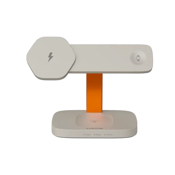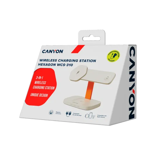 Transform your daily charging with the Hexagon WCS310 – a wireless charging station that combines style and practicality. Crafted with order in mind, this 3-in-1 charger can power up your phone, earbuds, and smartwatch all at once; there’s no need to juggle cords or hunt for spare outlets. The station’s sleek hexagonal design is a statement piece that adds sophistication to any space. But the look of it isn’t the most important part: it’s thoughtfully designed for perfect device placement, making every charge fast, secure, and hassle-free. With its Qi magnetic connection, the Hexagon WCS310 delivers efficient charging for all your Apple devices. It comes with a 20W adapter featuring interchangeable EU/UK plugs, so you can be ready for all the action whether you’re at home or traveling. The built-in LED indicator and soft backlight will inform you on the charging status while maintaining a subtle glow. Safety comes standard with 4 advanced protections (OCP, OVP, OTP, FOD), giving you peace of mind as you charge at full power (24W). It’s time for bulky charging to become history… while you enjoy a more elegant way to power up. The Hexagon WCS310 doesn’t just charge: it organizes, declutters, and simplifies your life. Finally, one charging station that does it all with style. Charge smarter and live better, redefining your tech life day by day.